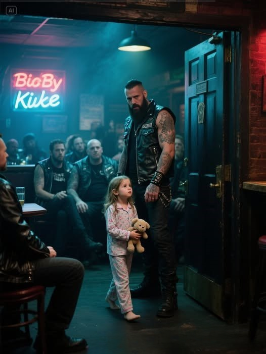 In the doorway stood a little girl, no more than six, dressed in Disney pajamas and holding a worn stuffed animal. Her cheeks were streaked with tears, her small body trembling. Thirty leather-clad bikers turned to look at her, stunned. This was no place for a child, especially not at that hour.