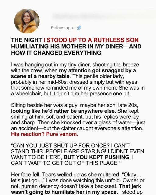 “No,” I told him. “Excuse her. She raised you. Fed you. Sacrificed things you’ll never know just so you could sit here in that jacket you didn’t buy. And you think tearing her down in public makes you a man? Not in my diner, it doesn’t.”