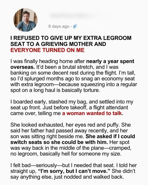 It didn’t stop the whispers. As we taxied to the gate after landing, I caught a woman two rows back hiss to her husband, “He wouldn’t even trade with a grieving mom.” Someone else aimed a theatrical sigh in my direction. A few tight smiles, a few pointed looks. I felt heat creep up my neck. It’s not that I’ve never helped strangers—I give directions, hold doors, share umbrellas—but this time I chose my own limits, and now I was wearing a scarlet S for Selfish.
