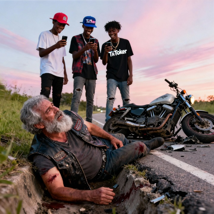 Three teenagers hit a motorcyclist and, instead of dialing for help, aimed their phones at him like it was a show. They laughed while a 64-year-old grandfather clawed across the pavement toward the mangled remains of his Harley, his left leg folded the wrong way, blood spreading under his helmet.