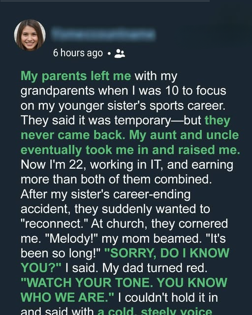 It began with cheerful holiday texts—“Merry Christmas, Melody! We miss you.” Then came awkward phone calls filled with forced questions about my life. It all felt rehearsed, fake. I ignored most of it.