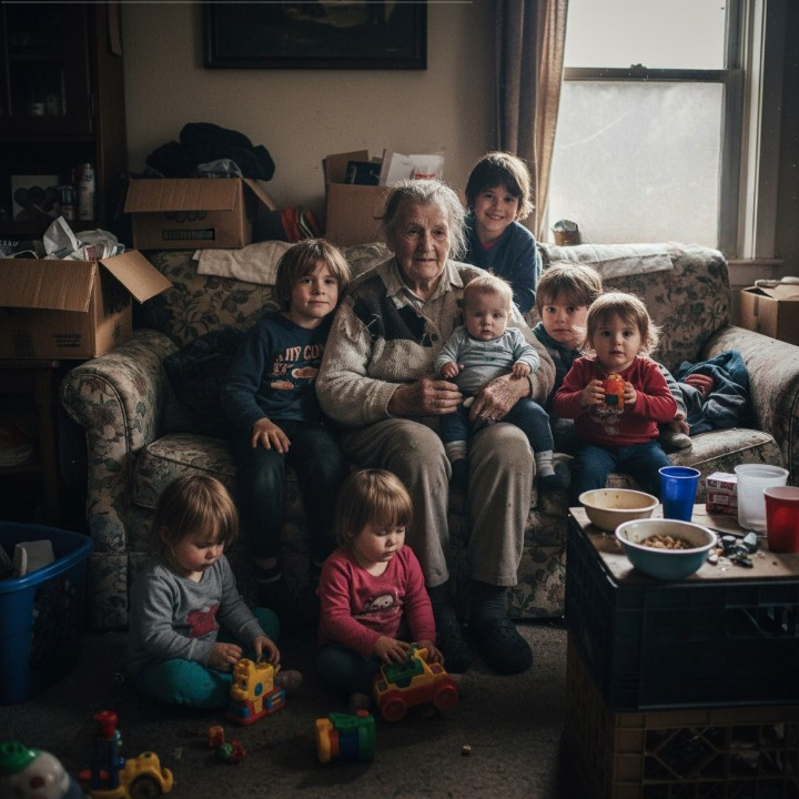 The rain beat against the windows with a furious rhythm, its relentless drumming echoing through Grandma Millie’s old house like the pulse of a restless ghost. The living room was in complete disarray—seven children scattered about like fallen leaves after a storm, each one lost in their own whirlwind of mischief and noise. Little Leo was on the rug surrounded by a sea of toys, his sticky hands determinedly stacking plastic dinosaurs into a wobbly tower. Across the room, Finn, the sullen teenager, sat hunched over his phone, completely oblivious to the chaos around him. The others were chasing each other, screaming, laughing, and somehow managing to turn every piece of furniture into an obstacle course.