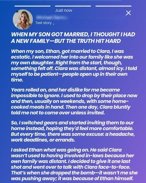 I asked Ethan what was wrong. He said Clara wasn’t used to involved in-laws; her family was distant, she needed space. I clung to that explanation and decided to try one last time—face to face with Clara. That’s when everything changed. She said the problem wasn’t me. It was Ethan.