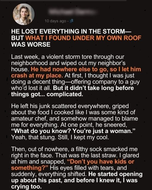 I told myself to be patient. The man had just lost his home, after all. But his temper worsened. He snapped over small things, blamed me for the weather, the power outage, the noise outside. Then, one night, while I was cleaning up, he muttered something that stopped me cold: