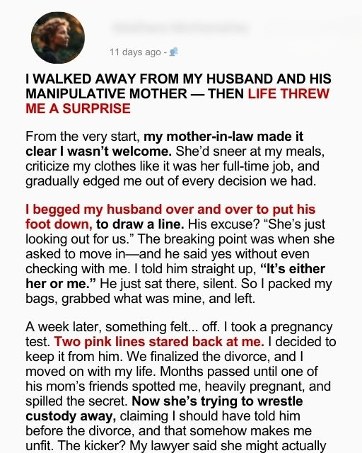 I thought escaping would be the end of it. A week later, something felt off. I took a pregnancy test. Two pink lines lit up. I decided not to tell him. We finalized the divorce, and I rebuilt my life in silence. Months passed, until one of his mother’s friends saw me, belly round, and ran to report it. Suddenly his mother was pushing for custody, insisting I’d hidden the pregnancy and that made me unfit. My lawyer warned me she might have a chance. I knew I had to fight—and I started planning.