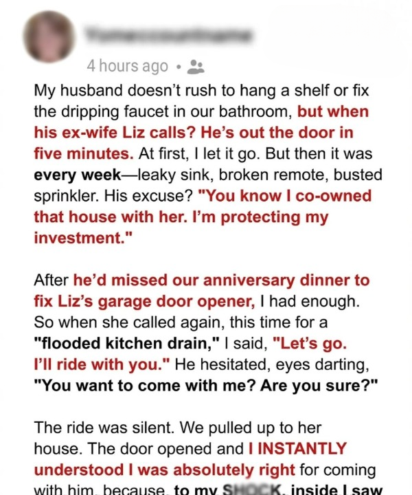 Months later, Liz found new people to call for her endless “emergencies.” The faucet in our own kitchen no longer dripped, and Henry began to notice the small things again — the coffee waiting on the counter, the laughter we’d almost forgotten how to share.