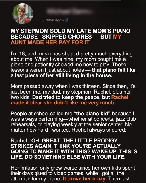 Rachel thought selling the piano would crush me. Instead, it destroyed her façade. Her reputation crumbled. My dad finally saw her for who she was and told her, “Enough.”