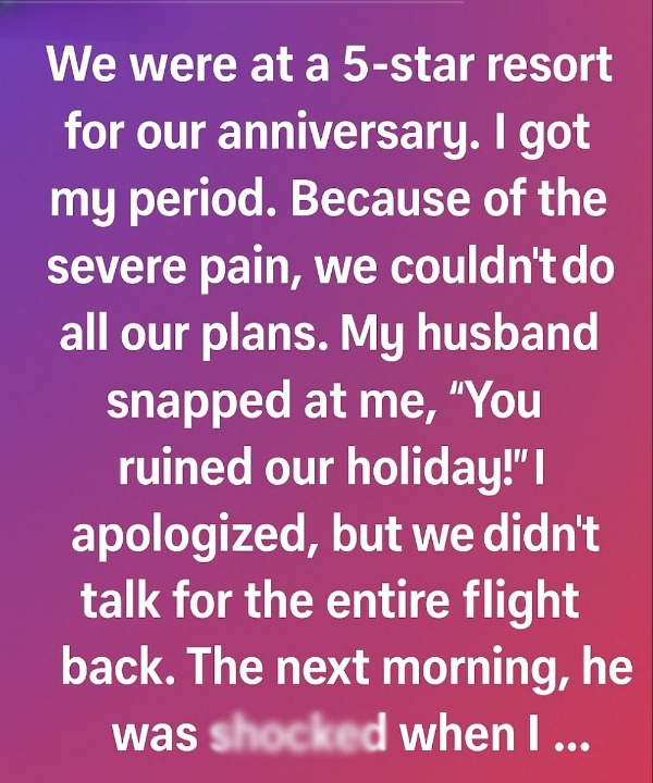On the flight home, the cabin lights dimmed and everyone around us fell into the soft, open-mouthed sleep of people who’ve had too much sun. He scrolled. I stared at the wing, replaying scenes I’d chosen to file away: the night I had a fever and he complained about eating takeout again; the time I asked if we could try counseling and he called it “dramatic”; the birthday I spent planning his surprise dinner while he forgot mine; me apologizing first, me apologizing most, me apologizing for bleeding.