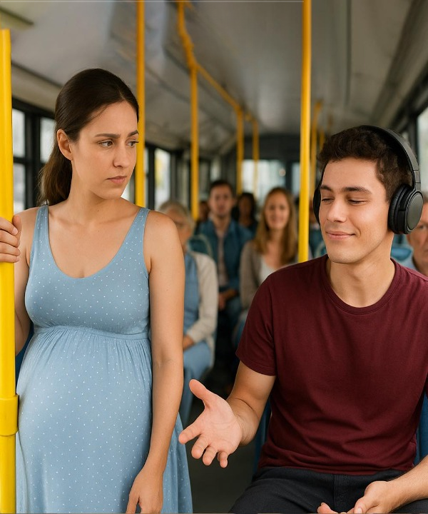 The city bus clattered along a tight, sun-baked street, every seat occupied, every strap claimed. Heat, chatter, and the faint squeal of tired brakes pressed in from all sides. At the next stop, a young woman climbed aboard in a simple summer dress, moving carefully, both hands resting over her rounded belly. Seven months along, she held herself with quiet poise—but the strain in her face made it plain that standing would be hard.