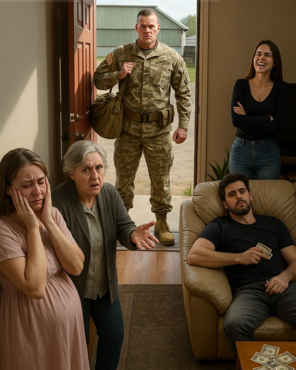 My husband stood there in uniform, duffel on his shoulder, cap tucked under his arm. Joy flashed across his face—he’d planned to surprise me. Then he took in the scene: his mother’s raised hand, Monica’s curled lip, Brett’s fist full of cash. The joy emptied out of him.