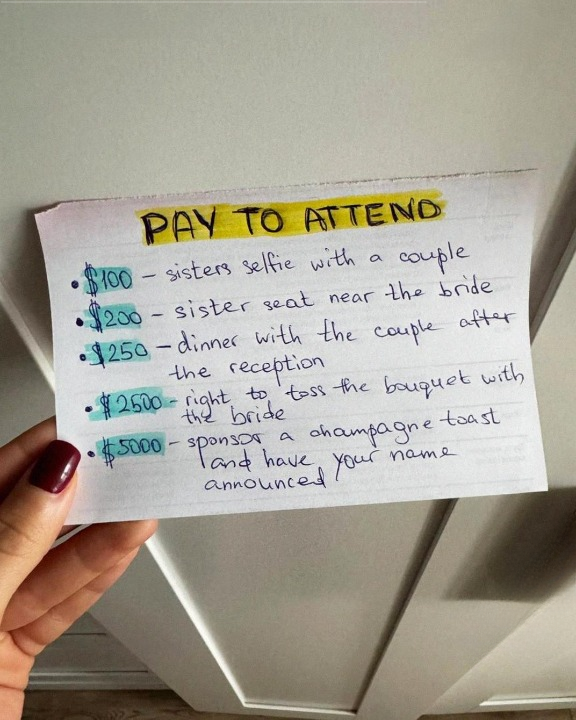 “Invest?” I said flatly. “You’re charging people to attend your own wedding.”