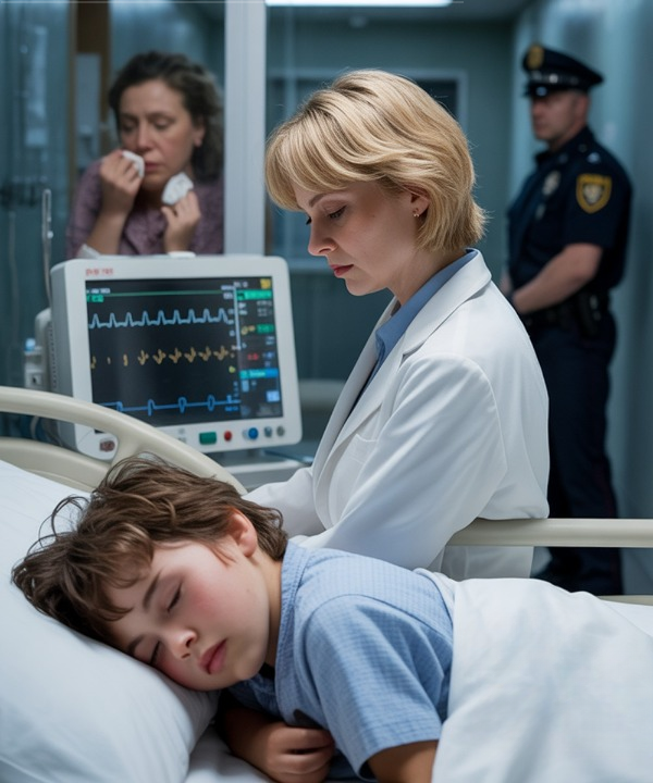 Minutes later, I was speeding toward the hospital, slipping through the back entrance where dim lights flickered over tense police officers. One raised a finger to his lips, motioning for silence. My heart hammered as I followed him down the corridor—until I looked through the window of my son’s hospital room. What I saw nearly stopped my heart.