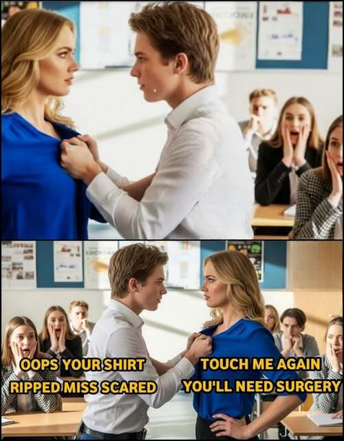 For a heartbeat, no one moved. Ms. Harner’s eyes flickered down to the torn seam of her blouse, then back up to the boy standing in front of her. Jadon hesitated — for the briefest second, guilt flashed across his face — then he covered it with a cruel grin.