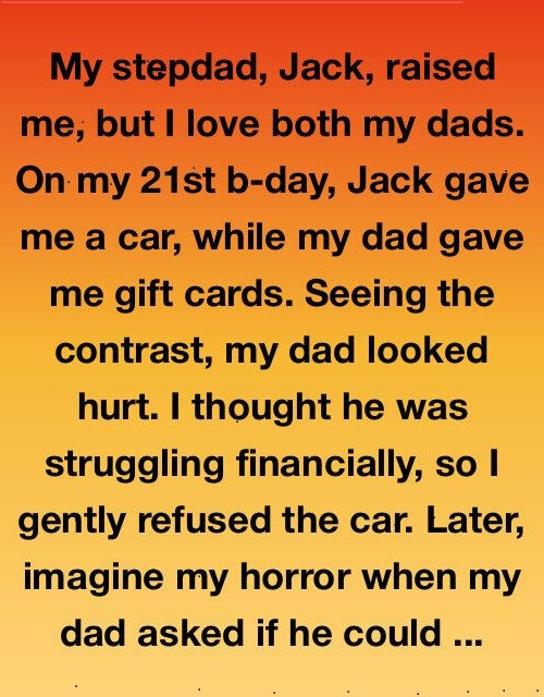 That afternoon, my stepdad, Jack , surprised me with something I could hardly believe—a brand-new car. It was sleek, shiny, and more than anything I’d ever imagined owning. The keys jingled in his hand as he smiled and said, “You’ve worked hard. You deserve this.” I was speechless. My biological dad, Mark , had given me a few gift cards—small but thoughtful things. He smiled awkwardly as I thanked him, but I saw it then—the flicker of sadness in his eyes. That quiet look that said more than words ever could.