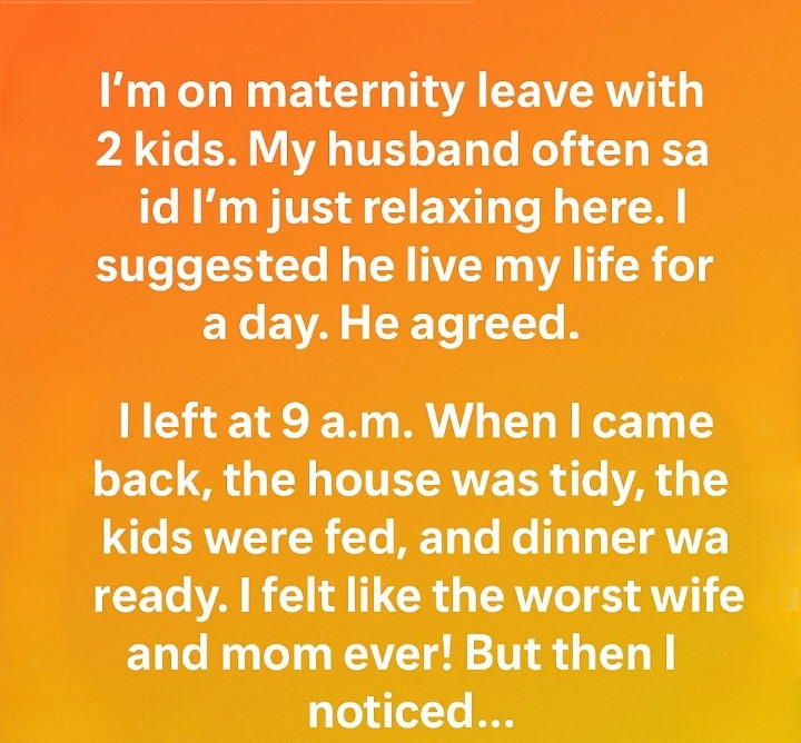 When I finally returned home that evening, I braced myself for disaster. But to my surprise, everything looked… perfect. The house was spotless, the kids were fed, and dinner sat waiting neatly on the table. For a fleeting second, guilt washed over me. Maybe I really had been overreacting. Maybe I wasn’t doing as much as I thought.