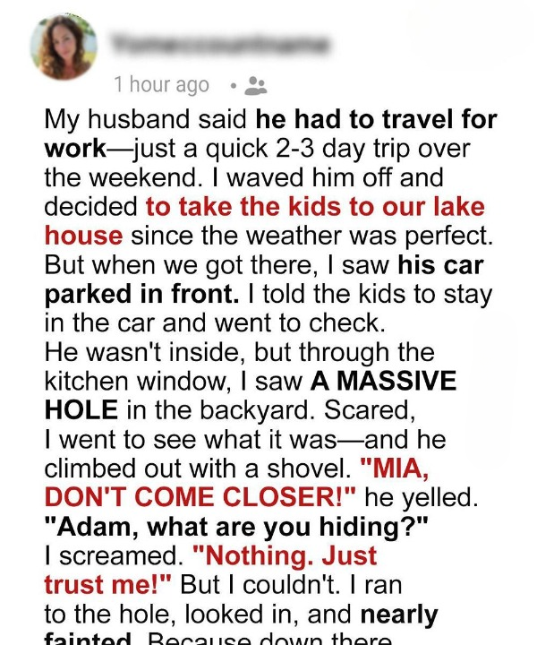 Mia had always believed her husband, Adam, was a man of honesty and routine. So when he mentioned that he’d be out of town for a few days on a business trip, she didn’t question it. The timing even seemed perfect — she decided to take their kids for a spontaneous weekend escape to the family’s lake house. It was supposed to be a simple, peaceful getaway filled with laughter, swimming, and rest.