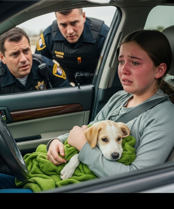 Two officers approached, expecting a joyriding teenager. Instead, they found a trembling twelve-year-old behind the wheel, tears streaking her cheeks, one hand on the wheel and the other bracing a blanket-wrapped puppy.