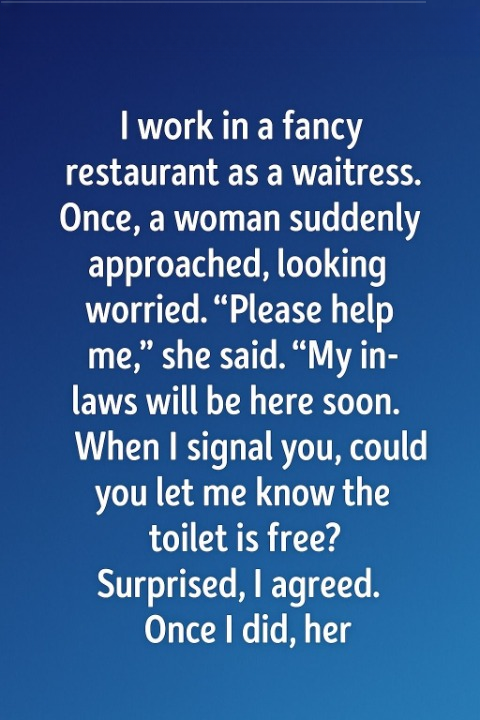 She approached the counter with a soft, trembling voice. “Please help me,” she said. “My in-laws will be here soon. When I signal you, could you tell me the restroom is free?”