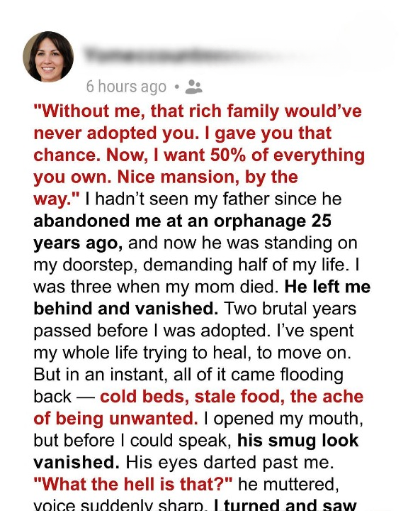 “You’re my daughter,” he continued, his voice slick with entitlement. “And by law, I deserve my half. You wouldn’t have this life if it weren’t for me. I gave you up so you could have a better future — so you could be adopted by a rich family.”