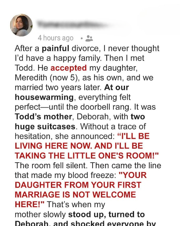 When I opened the door, I froze. Standing there was Todd’s mother, Deborah, with two enormous suitcases stacked beside her.