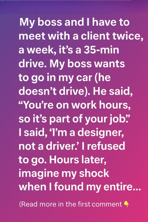 He insisted it was “part of my job” since the meetings happened during work hours. But I’m a designer, not a chauffeur. I took a deep breath and explained politely, “I’m happy to attend the meetings, but my car isn’t part of the company fleet, and I’m not responsible for transportation.”