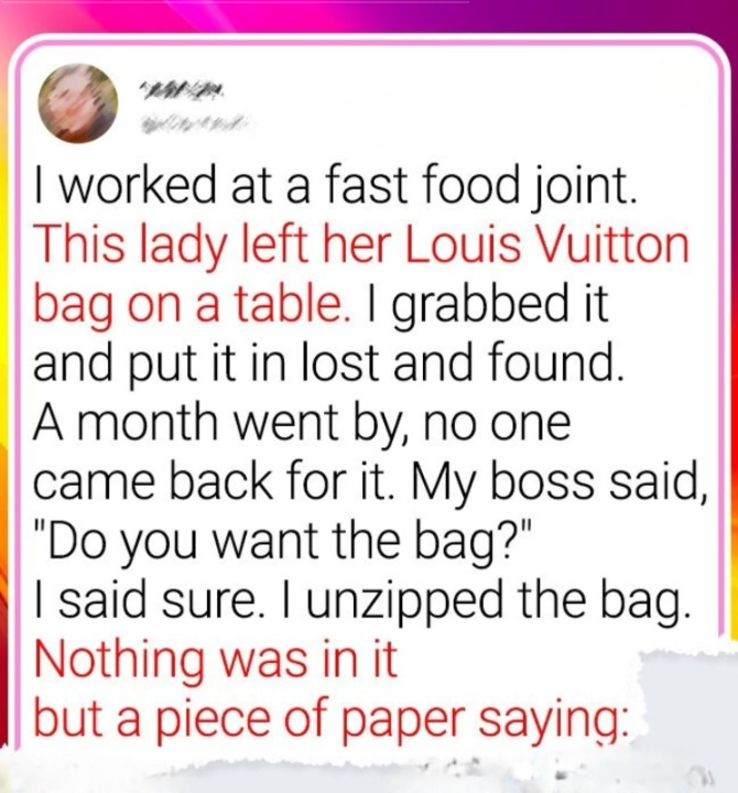 I stood there in the quiet restaurant, holding that note, feeling something stir inside me. It wasn’t disappointment—it was reflection. Maybe that bag wasn’t forgotten at all. Maybe it was left there on purpose, by someone who wanted to see if honesty still existed in small corners of the world.