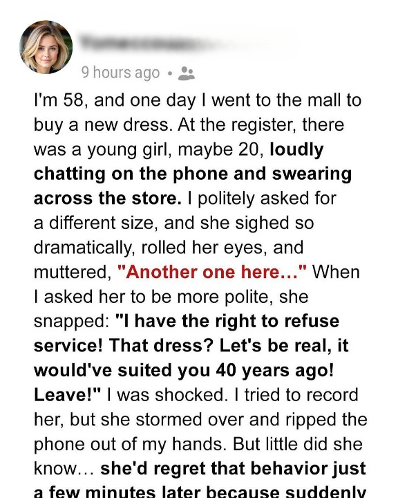 Her tone stung more than I expected. I tried to stay calm, but when I asked if I could speak with the manager, she scoffed. “Go ahead,” she said, crossing her arms. When I reached for my phone to note the store details, she actually grabbed it out of my hand and said, “You don’t need to record anything.” My cheeks burned. I felt small, humiliated — all because I had asked for a dress.