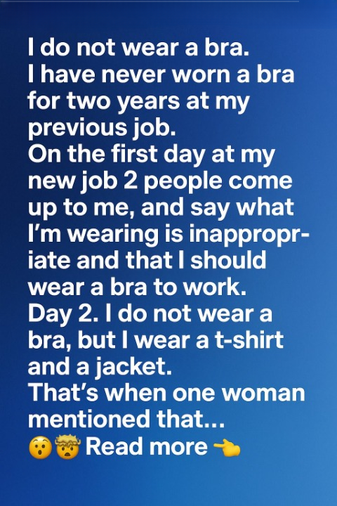 The next day, I came in wearing a plain T-shirt layered under a light jacket. Again, no bra. I noticed some glances, but I ignored them. That afternoon, a woman from my team approached me privately. I braced myself for another round of criticism, but instead, she surprised me.