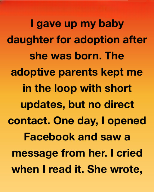 A few weeks later, we met in person at a botanical garden. When I saw her walking toward me, I burst into tears. We hugged like time had never passed. I explained that I hadn’t given her up because I didn’t want her—I did it because I wanted her to have more. She cried and whispered, “I always wondered if you didn’t want me.”