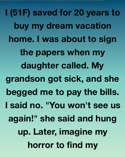 When I, Elara (51F), finally saved enough to buy my dream vacation home after twenty years of sacrifice, I thought my independence was secured. But just before signing the papers, my daughter Chloe called—her son, my grandson Finn, was gravely ill, and the hospital needed an immediate payment for surgery. When I refused to help, she said, “You won’t see us again,” and hung up.