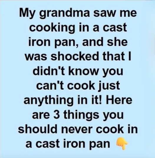 One afternoon, I tried to surprise her by cooking dinner. I grabbed her largest cast iron skillet, proud of its gleaming, seasoned surface. But when she saw me chopping tomatoes, she stopped in her tracks. “Oh no, honey,” she said, half laughing, half horrified. “You can’t cook that in a cast iron pan.”