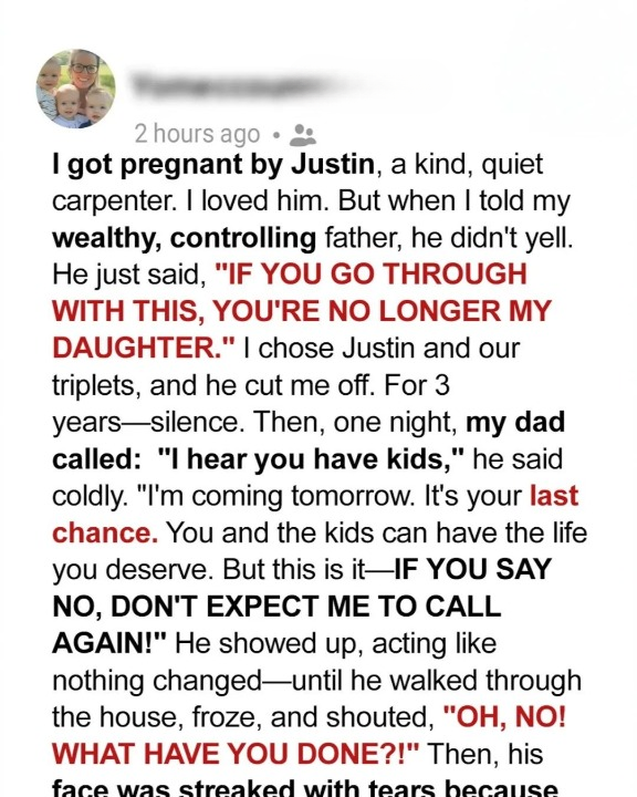 Hours later, as the sun began to set, I heard a knock at the door. My father stood there again, his face wet with tears. For the first time, I saw not the proud, stubborn man I’d grown up with, but a father weighed down by regret.
