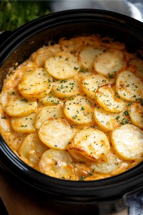 Cover the slow cooker and cook on LOW for six to eight hours, or HIGH for three to four hours. Slow cooking allows the potatoes to soften perfectly and the sauce to thicken naturally. You’ll know it’s ready when the edges are bubbling and golden brown.