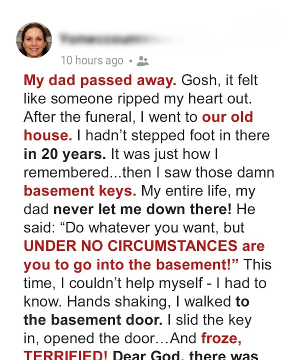 My dad passed away, and it felt like someone had torn a hole straight through me. After the funeral, I drove back to our old house. I hadn’t set foot there in twenty years. Everything looked almost the same—until I noticed the basement keys.