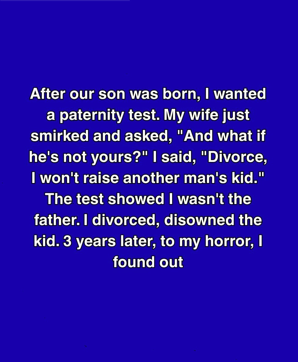 After our son was born, I asked for a paternity test. My wife just smirked and said, “And what if he’s not yours?” I told her plainly, “Then I’ll divorce you. I’m not raising another man’s child.” When the results came in, the test said I wasn’t the father. I filed for divorce and walked away from both of them. Three years later, I found out the truth—and it destroyed me.