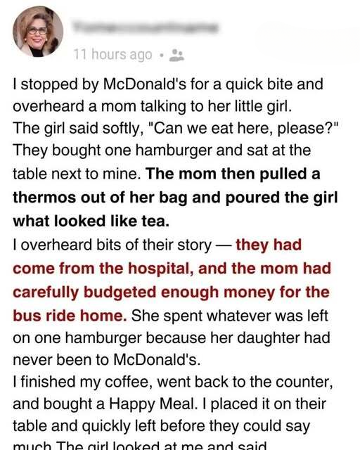 Something about that moment stayed with me. The mother’s gentle restraint, the child’s small disappointment—it tugged at my heart. When it was my turn to order, I quietly asked the cashier to add a Happy Meal to their order and not to mention it came from me.