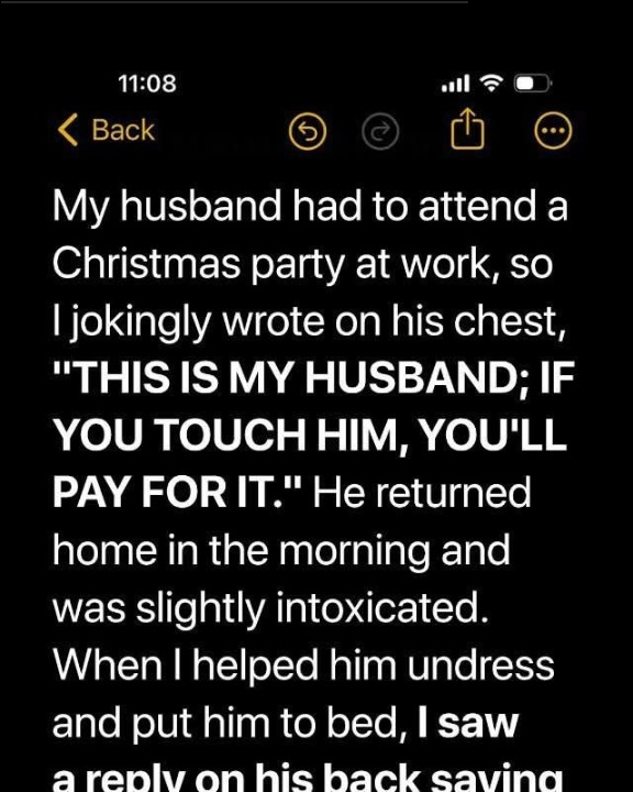 But when he finally stumbled through the door long after midnight—disheveled, reeking of alcohol, and barely able to stand—Micaela’s good humor disappeared. She helped him out of his jacket and led him toward bed, only to freeze when she saw his chest.