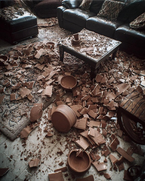 The cabinet door hung open. Every shelf was empty. The floor was littered with broken pottery, shards scattered like confetti.