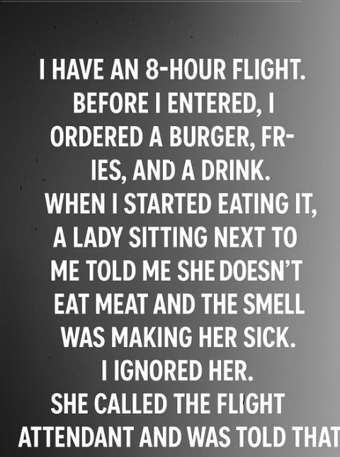 Once I settled in and started eating, I noticed the woman sitting next to me shift uncomfortably. A moment later, she turned and said, “Excuse me, I don’t eat meat. The smell is making me nauseous.” Her tone wasn’t hostile, but it was firm.