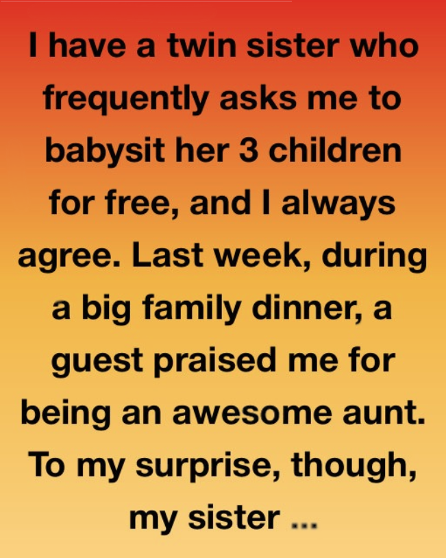 I have a twin sister who often asks me to babysit her three kids without pay, and I’ve always agreed. Last week, during a big family dinner, a guest complimented me for being such a devoted aunt. To my surprise, my sister laughed and said, “Oh please, she only watches them when I have no one else. She’s always complaining about it.”