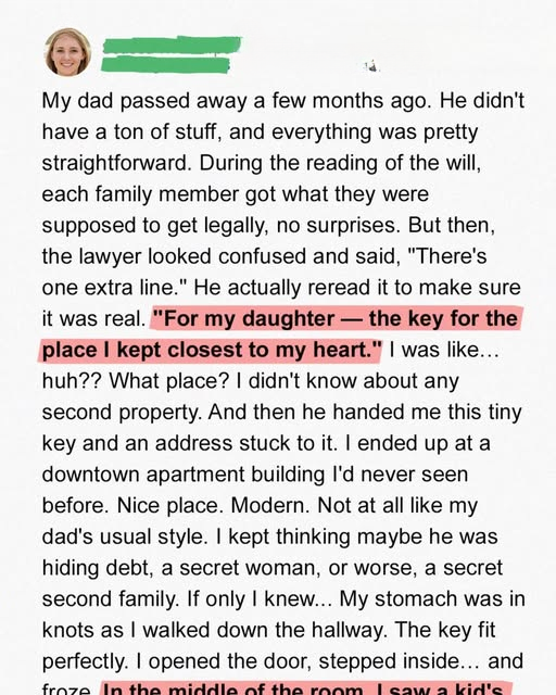 A few days later, after gathering the courage to face whatever waited, I drove to the address. It led me to a sleek downtown apartment building, tall and modern—so unlike anything my father would ever choose. He had always preferred the comfort of old, familiar spaces, the kind that creaked and carried memories in their walls. Standing in the lobby of this pristine, glass-walled building, I felt out of place, as though I had stepped into someone else’s world. My pulse quickened as I took the elevator up, the key cool and heavy in my trembling hand.