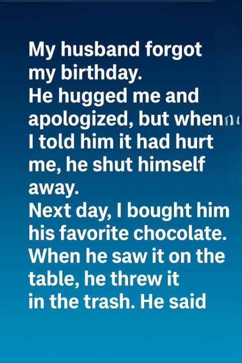 He wrapped his arms around me and apologized, but when I told him how deeply it had hurt, something in him shut down. He pulled away, closed himself off, and spent the rest of the evening moving around the house like he was trying to disappear. The next morning, I decided to try something small. I went out and bought his favorite chocolate, thinking maybe it would soften the moment that had gone so wrong. But when he saw it sitting on the table, he picked it up, walked to the trash can, and dropped it in without a second thought. He told me he didn’t deserve kindness — not when he had forgotten something so meaningful. I stood there stunned, because it hit me all at once that this moment wasn’t truly about my birthday anymore.