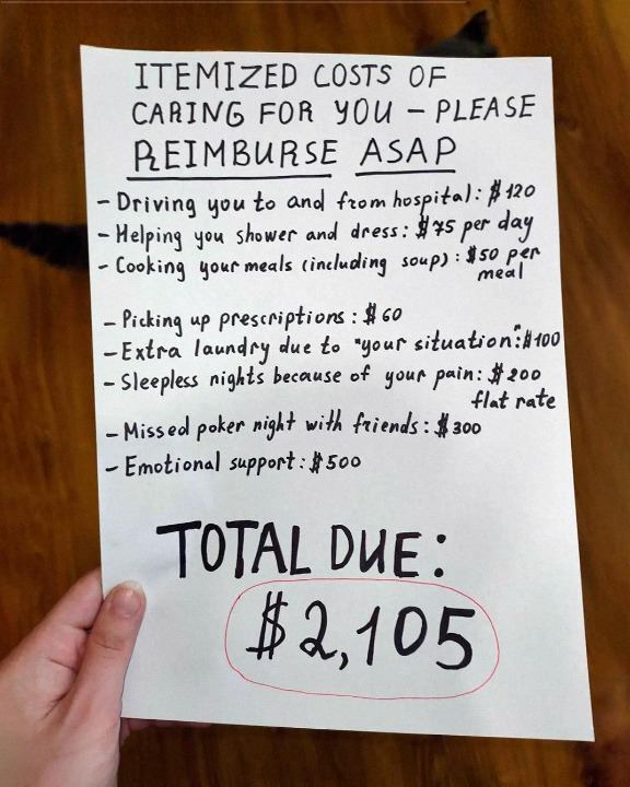 “Itemized Costs of Caring for You — Please Reimburse ASAP.”