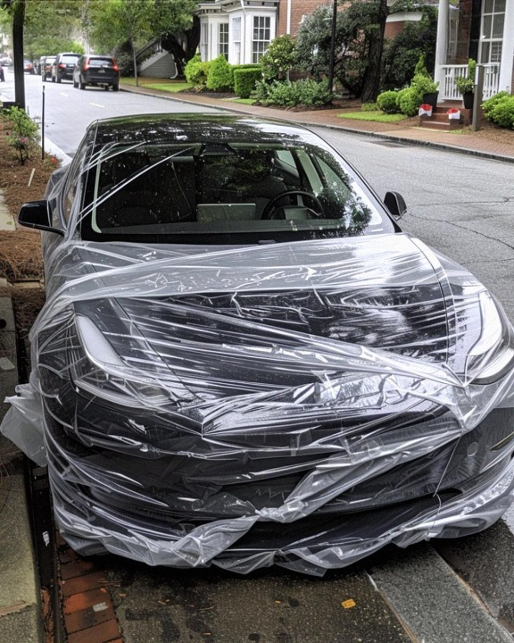 When I stepped outside, I froze. My entire car was wrapped—completely mummified—in thick, sticky tape. Every inch of it.
