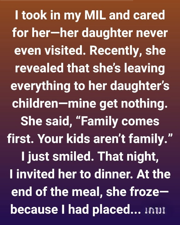 When my mother-in-law became too fragile to live on her own, I didn’t hesitate for even a moment. I opened our door — and our lives — to her. I managed her medications, helped her with her daily routines, prepared the meals she loved most, and made sure she never felt lonely or forgotten. Even though her own daughter barely called and rarely visited, I never once complained. To me, family wasn’t something you claimed when it was easy — it was something you proved through your actions. And I wanted my children to grow up seeing that compassion is a responsibility, not a chore.