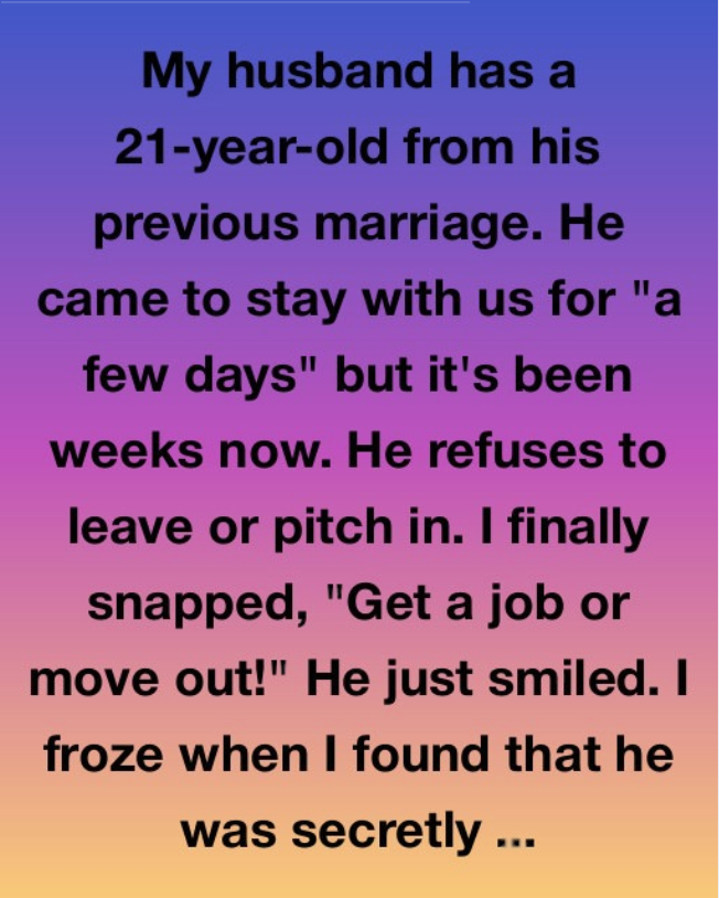 My husband has a 21-year-old son from his first marriage. He came to stay with us for “a few days,” but “a few days” has turned into weeks. He refuses to leave and refuses to help. I finally snapped and said, “Get a job or get out!” He only smirked. And everything changed when I discovered he’d been secretly living a double life right under our roof.