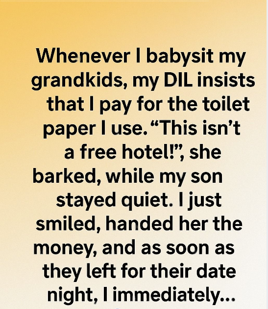 When my daughter-in-law stared me down, handed me a lone roll of toilet paper, and said, “You’ll need to pay for anything you use — this isn’t a free hotel,” I actually thought I misheard her. Surely she was joking. I wasn’t some stranger off the street — I was there to babysit my grandchildren so she and my son could finally enjoy a rare night out. I’d watched those kids countless times over the years without ever asking for a dime.