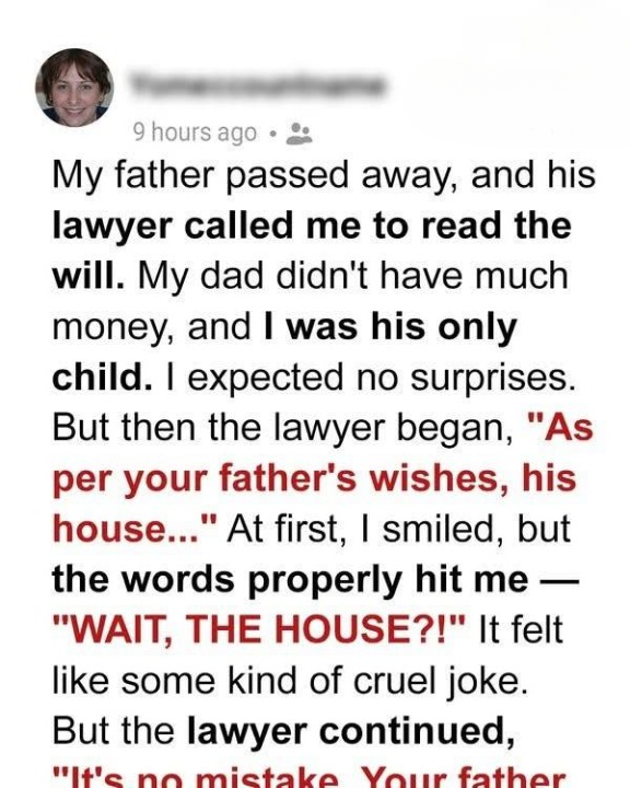 I always knew my father lived a simple life. No luxury, no savings tucked away somewhere, no hidden fortune. So when he passed away and his lawyer contacted me about his will, I expected nothing more than a few sentimental belongings — maybe his old watch or a box of family photographs.