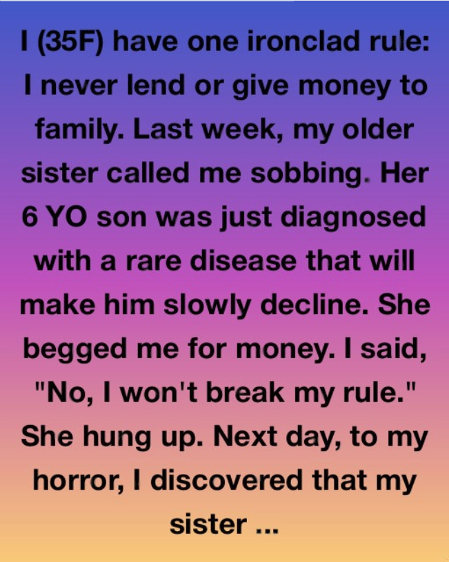 I’m 35, and I have one rule I’ve never broken: I do not lend or give money to family. Ever. But last week, my older sister called me in tears. Her six-year-old son had supposedly been diagnosed with a rare disease that would slowly deteriorate his health. She begged me for financial help. I told her, “No, I’m not breaking my rule.” She hung up on me.