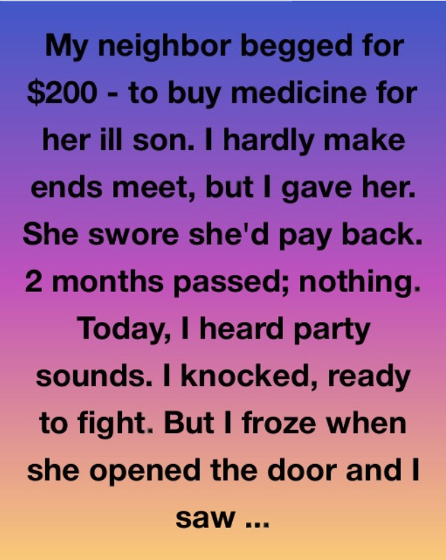 My neighbor once pleaded with me for $200 — money she said she desperately needed to buy medication for her sick son. I barely scrape by myself, yet I handed her what I had. She promised she would pay me back. Two months passed with nothing. No calls. No texts. No updates. Today, I heard loud music, children laughing, and the unmistakable sound of a party coming from her apartment.